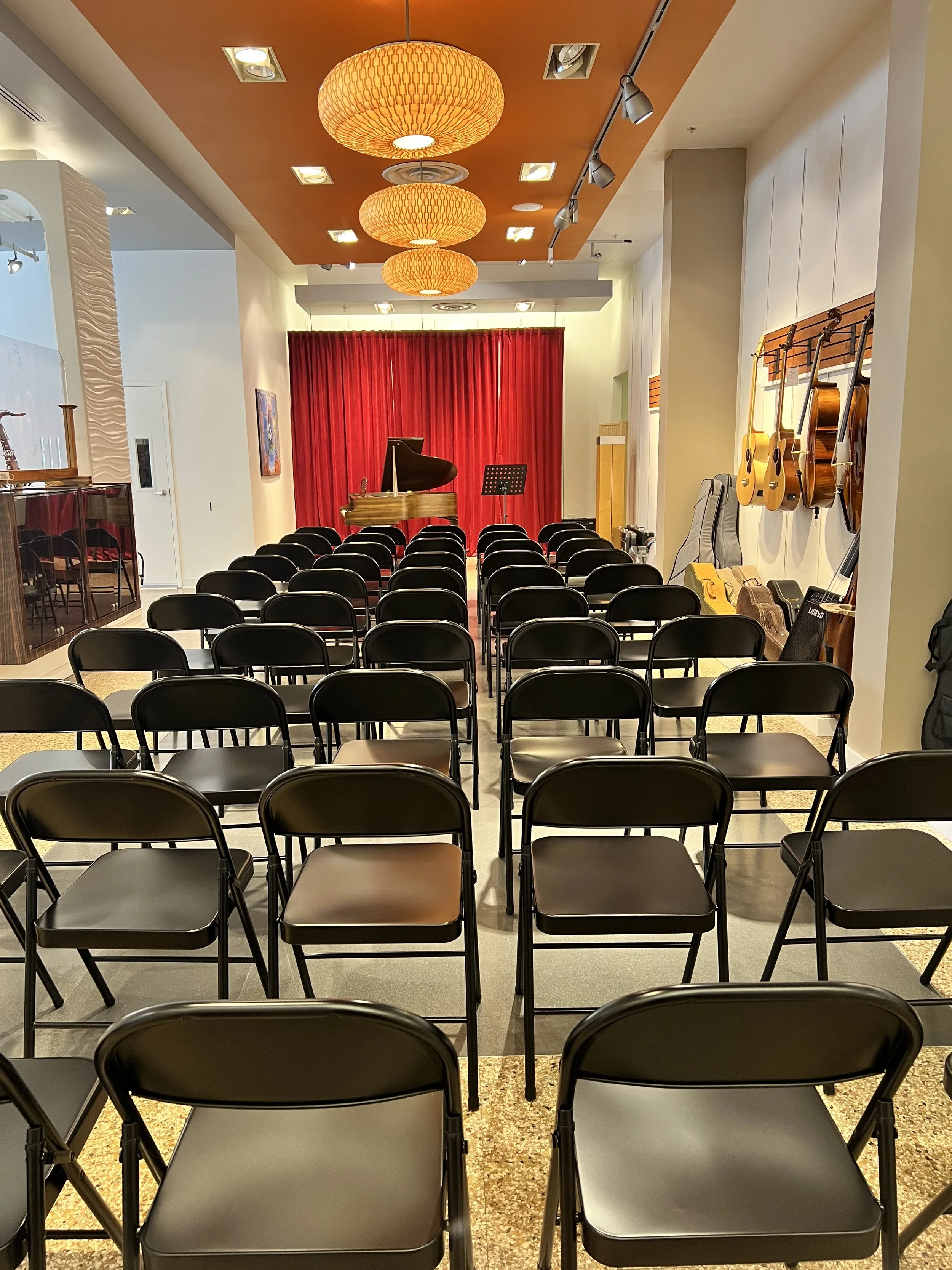 Our space is ideal for various musical events, from intimate recitals to casual jam sessions. The acoustics are well-balanced, ensuring that every note sounds clear and resonant. The room’s design, with its inviting red curtains and thoughtful setup, provides just the fitting backdrop for a memorable performance. It’s a place where performers and audiences can feel at ease, allowing the music to take center stage.